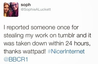 I got a message on tumblr once saying that someone on wattpad had posted one of my stories amongst loads of other pieces written by people on wattpad. I’d been credited but I didn’t think that was the point – I hadn’t given my consent for my work to be published anywhere else online and I like having control of where my content is going. I reported the chapter to wattpad and the chapter was taken down within a day – reporting people or pages can be really effective.