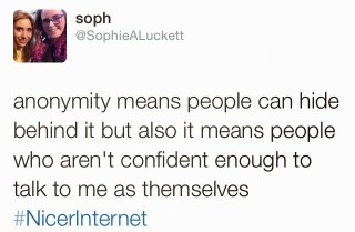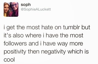 Can’t talk about internet hate without mentioning anonymous messaging, can you? This is the one instance where I did disagree with what they were saying but I think this is because the people on the show were thinking of it from a completely negative/hate perspective? I receive so, so many lovely, adorable anonymous messages on tumblr that it totally outweighs the negative messages. There are two sides to every coin and whilst it also means the negative comments come from the void, it means people can hide when they’re not happy or confident enough to be themselves and if that gives them the confidence to speak to people they wouldn’t usually talk to, then I think that can be a positive thing.