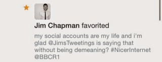 Another relevant point from Jim Chapman! He said that for a lot of people, their lives are lived almost completely online and he said this completely straight voiced (I’ve not seen the video yet, he may also have been straight faced) without a skip in his step – he wasn’t condemning people who have high profiles online or taking the mick and saying people should live in the real world. It was really refreshing to not be looked down on in that respect. Jim may have appreciated what I said because he favourited my tweet.