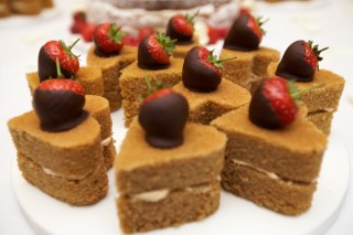 I went up to the counter and picked a slice of cake with butter cream icing and a chocolate-dipped strawberry on the top. I couldn’t help but smile just looking at it.