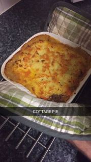 There was cheesy mash, there was beef that didn’t give us food poisoning and there was seasoning it was glorious! We need to work on portion sizes etc because there was way too much for three of us but it was really good.