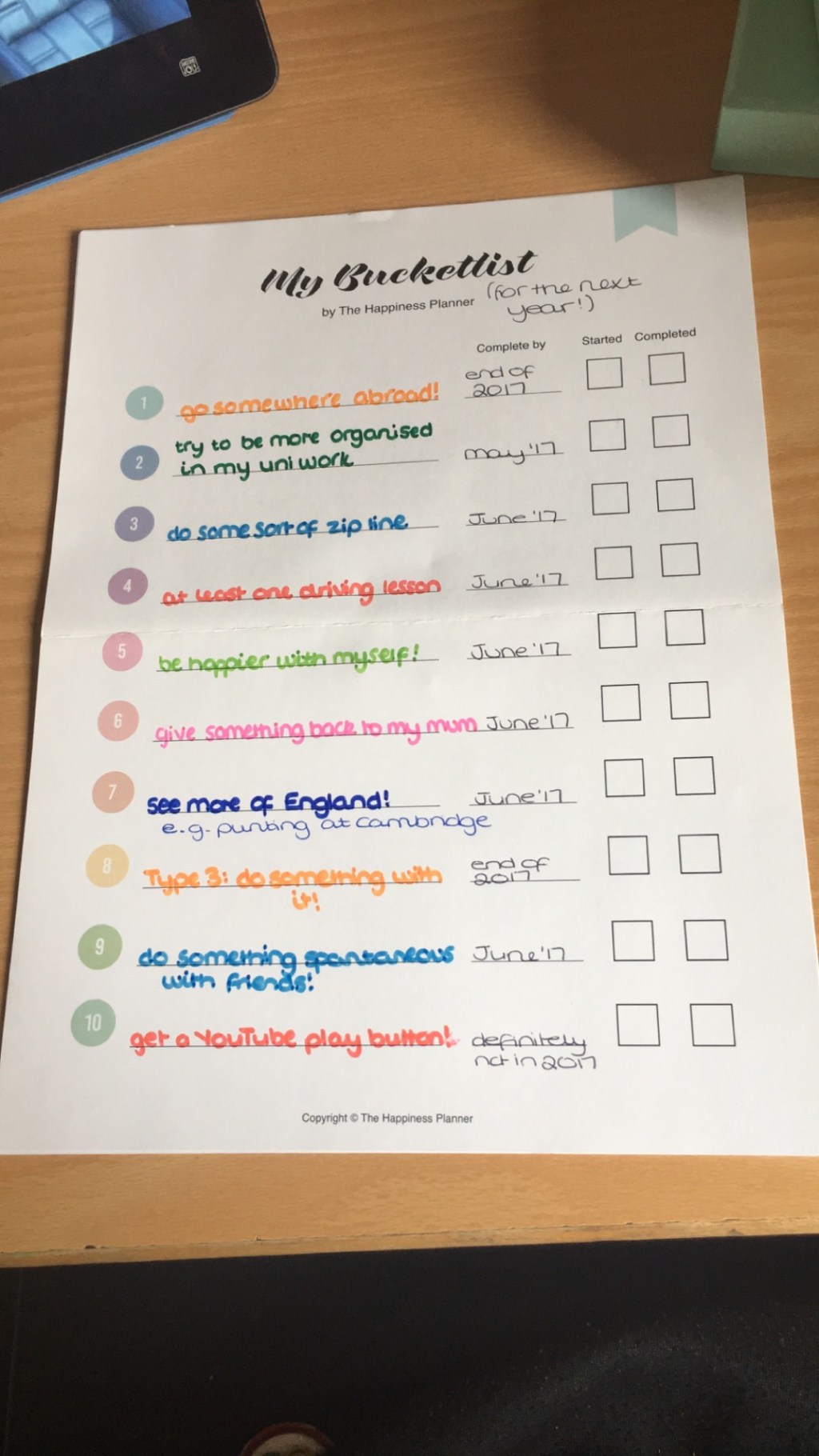 The other page I filled in was ‘My Bucket List’. I decided that as the planner only lasts a year, I’d pick some bucket list items that I could realistically complete within a year (rather than keeping the sheet for the rest of my life and losing it!). I picked some things such as have at least one driving lesson and do more travelling within my own country, but other things like go abroad at least once before the end of 2017 and do a zip line! (There’s one in Bournemouth that goes over the sea that I really want to try!)