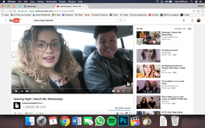 With YouTube in mind, I’m obsessed with ItsWayPastMyBedtime, Carrie Hope Fletcher, and her series ‘Watch Me, Wednesday!’ where she vlogs her adventures playing Wednesday Addams in The Addams Family UK tour. I’ve already got my tickets for opening night at Mayflower Theatre in Southampton and if you’re a student, I thoroughly recommend having a look because they’re only £15 a ticket for students! Down from the full price of nearly £40, I couldn’t resist and I imagine I’ll be treating myself to move tickets after I’ve seen the show because I know I’m going to love it, I already love so many of the songs and I cannot wait. I just can’t wait and this series is making me even more excited.
