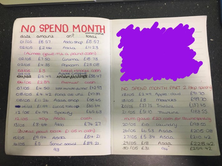 Then April pay day rolled around – I used some of that to pay off the last of the money I owed my mum (for rent payments I couldn’t afford and a deposit I didn’t have money for, felt nice to get that finally paid off!) and from there I decided I would spend nothing except on food shopping and my two monthly direct debits (for Adobe Creative Cloud and Spotify) because I really want to get out of my overdraft.