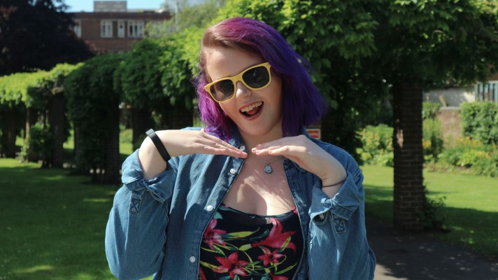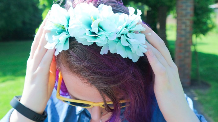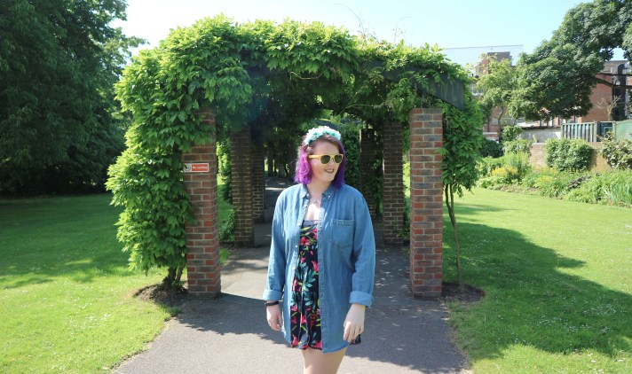 This outfit is made up of a dress I got from Asda (I think) last summer and a denim jacket I bought from Primark last summer, sometimes accompanied by a flower crown headband I bought from Flying Tiger and sunglasses I got from EE at Summer in the City, a YouTube convention, in 2015 for free. The main reason I wore my burgundy Dr Martens was because I knew I was going to have to do a lot of walking that day and they’re my comfiest shoes but also they look a little bit badass.