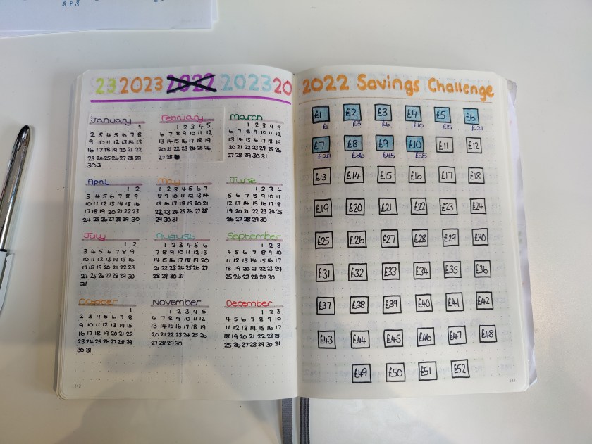 Next I have the tracker for my savings challenge, which I mostly just enjoy getting to colour in a square every week. I also have a weight loss tracker on the reverse page but I don’t feel comfortable enough to post that on the internet just yet, the same principle applies though but it’s extra satisfying because it’s much harder work to be able to colour in a square on that tracker.