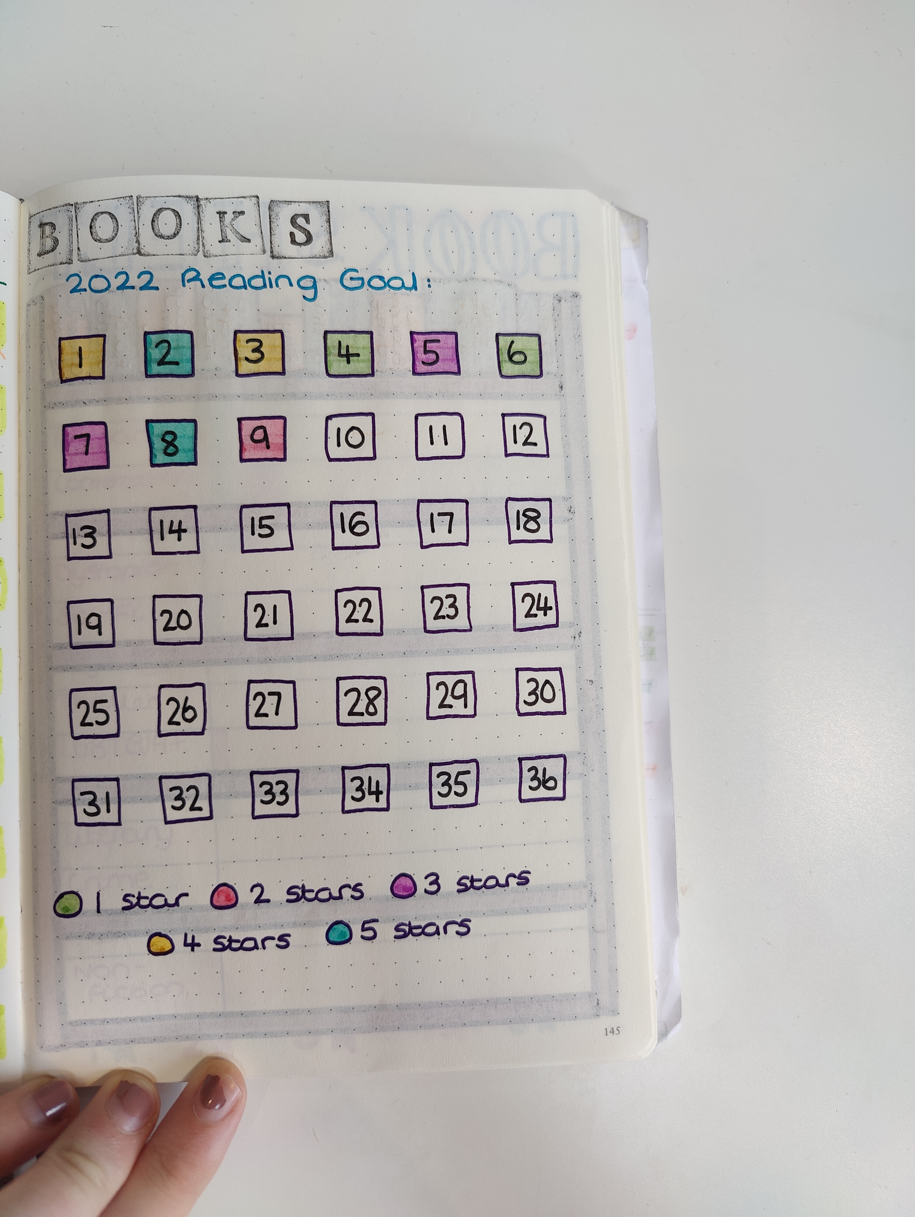 I’ve seen lots of people on tiktok have separate reading journals but the whole point of my bullet journal is to streamline everything into one notebook. Here I have more boxes to colour in as I get closer to my annual reading goal, I write down what I’m reading, I’ve got a ‘book of the month’ tracker which can help me pick a book of the year as well as a cute looking bookshelf and a genre tracker, so I can see which genres are my highest rated.
