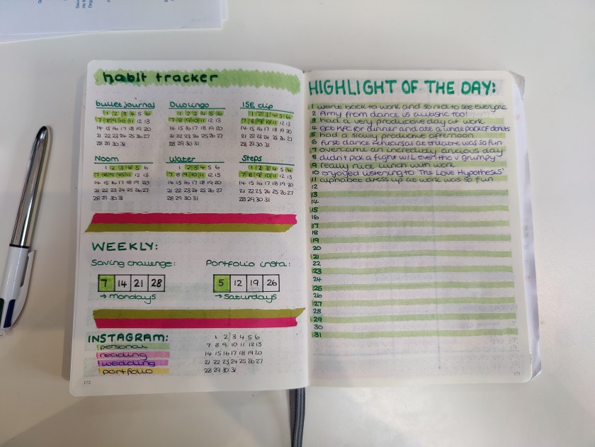 Making the trackers page is my least favourite part of every month because I have to write the dates out so many times but it’s a really good way of keeping things I want to work on in the forefront of my mind – the tasks I want to do every day like filling in my bullet journal and doing my Duolingo, health goals like drinking enough water and doing my step goal – seeing them and being able to (or not able to) tick them off every day makes the world of difference!