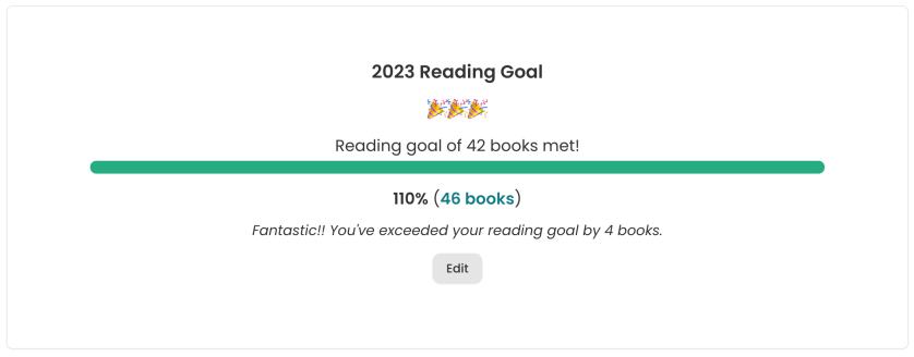 I mean, sharing this is completely irrelevant since I’m not updating my goal, but even Storygraph has given me little party poppers and it makes me happy.