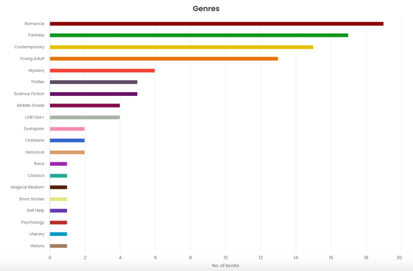 I don’t think I included this data in Q1 either, but I’ve really expanded the authors I’m reading and which authors I’m repeating too. Though so far, all of these authors are here because I read a series – Anthony Horowitz wrote Alex Rider which I finished in January, Becca Fitzpatrick wrote the hush, hush series which I regretted reading in May and Naomi Novik wrote the Scholomance series which I’ve read over the course of the year. Some of these authors I have other books from – I have another Anthony Horowitz series, I am waiting for the day that Helen Hoang announces her next book and I have a couple of other Colleen Hoover books in my library. I do like reading a series but I get panicked that I’ll forget details so I make myself read the entire series in one go, which when a series like Alex Rider has 13 books is a lot of commitment. The longest series I own is probably Skulduggery Pleasant so there’ll be a lot more Derek Landy in this graph when I get to that!