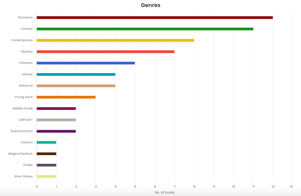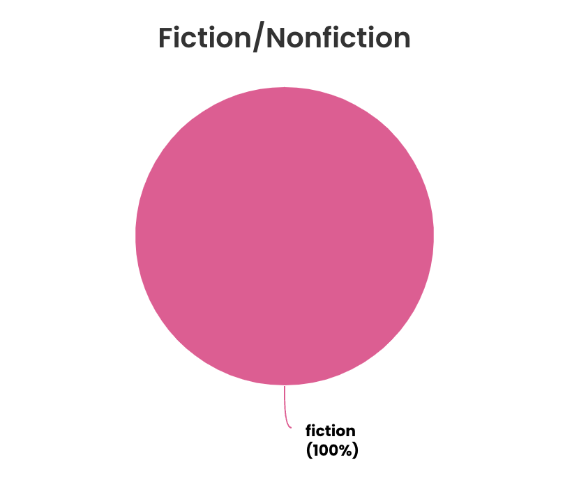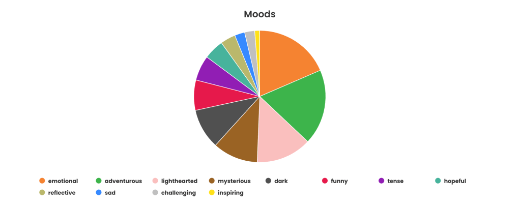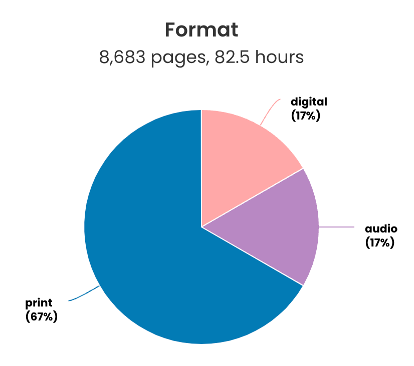 This is the kind of pie chart that I love – I like that I read from different sources, but I’m also glad that I’m predominantly reading print books because that means I’m working on my physical tbr. Again, the data isn’t entirely accurate because I can’t track co-reading without Storygraph thinking I’ve read a book twice, but hopefully this is a feature they’ll implement someday!