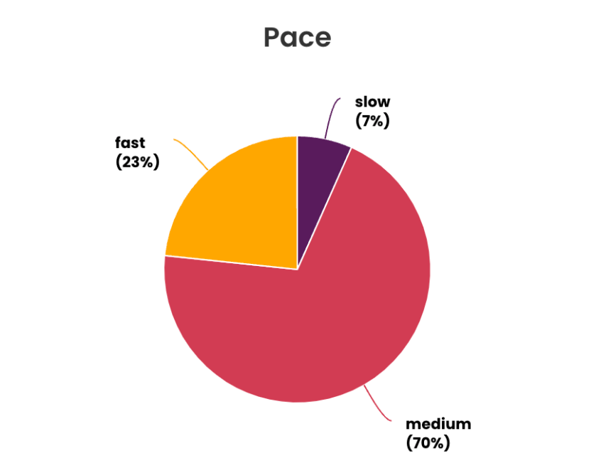 I think pace is so subjective and again this is from Storygraph data and not my reviews – I don’t think it’s a surprise that I’ve predominantly medium paced books because I feel like they’re pretty standard? And I wouldn’t even agree that all of the books that have been listed here are necessarily slow paced.