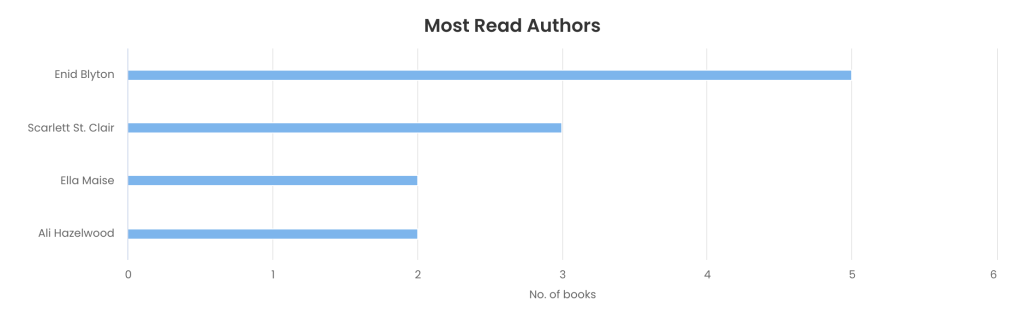 I don’t want to keep ‘justifying’ why the Famous Five books are altering my stats so much, but I do feel the need to clarify that it’s not because I’m an Enid Blyton super fan or anything – it’s just a reading challenge that is skewing my stats a little bit! Scarlett St Clair is because I finished reading the Hades x Persephone series earlier this year, then some of Ella Maise’s books are included in the Audible Plus catelogue and it makes them feel like free audiobooks and I am an Ali Hazelwood super fan – I read her new releases as soon as they came out. Maybe I’ll reread her other books to push her higher up the rankings!