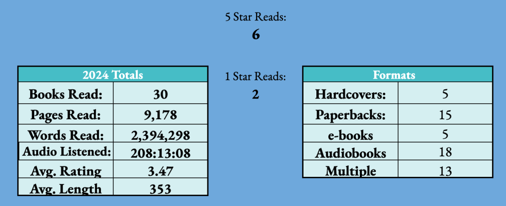 So far this year I’ve read 30 books, which was 9,178 pages and over 208 hours of audiobooks! Some of them I read just as physical books, some just as audiobooks, some I co-read, some were new releases and some are from my backlist. By goal for the year is 52 books and I’m currently over halfway and several books ahead of schedule! I’m not doing as well as I did this time last year – my reading goal last year was 42 books and I hit that goal by the end of June, but I went on my two week honeymoon where I did nothing but read so that definitely helped. I have read something every single day this year and I’m happy with that!