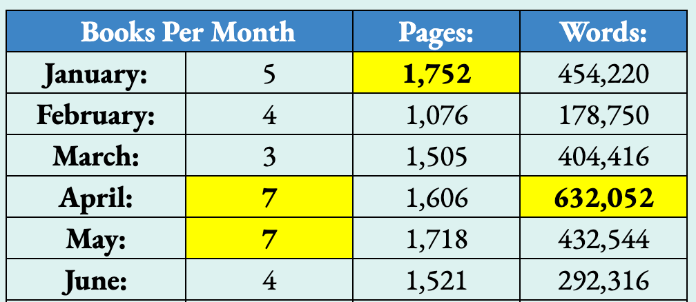 I’ve never really got the fuss of tracking pages, but using another spreadsheet which tracks pages each month, there are some months where I read more pages even though I’ve finished less books. This spreadsheet also tracks the number of words I’ve read, but the website that estimates word count doesn’t have every book I’ve read this year so it’s not particularly accurate.