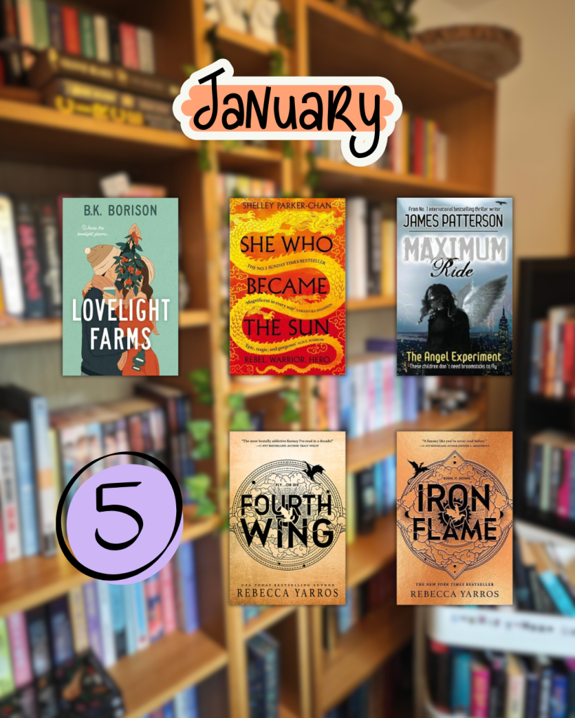 A mixed reading month for sure – Lovelight Farms was the book I didn’t finish before the end of 2024, then I read a couple of other books before starting my Fourth Wing reread ahead of the release of Onyx Storm (except I didn’t plan it very well and didn’t leave enough time to read Onyx Storm on release).