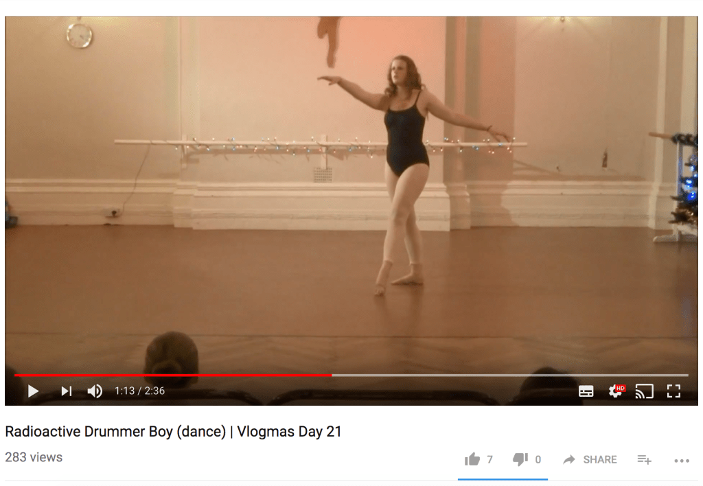 Dancing has been part of my life since I was three years old and this is the only video I have of it on my channel. I want to include more than just my professional achievements and also include the content I’ve produced that I’m most pleased with. My friend filmed this video for me but I choreographed this routine and I think it was one of the first and only times I’ve performed solo so it was a personal achievement as much as it was a video for my first Vlogmas.